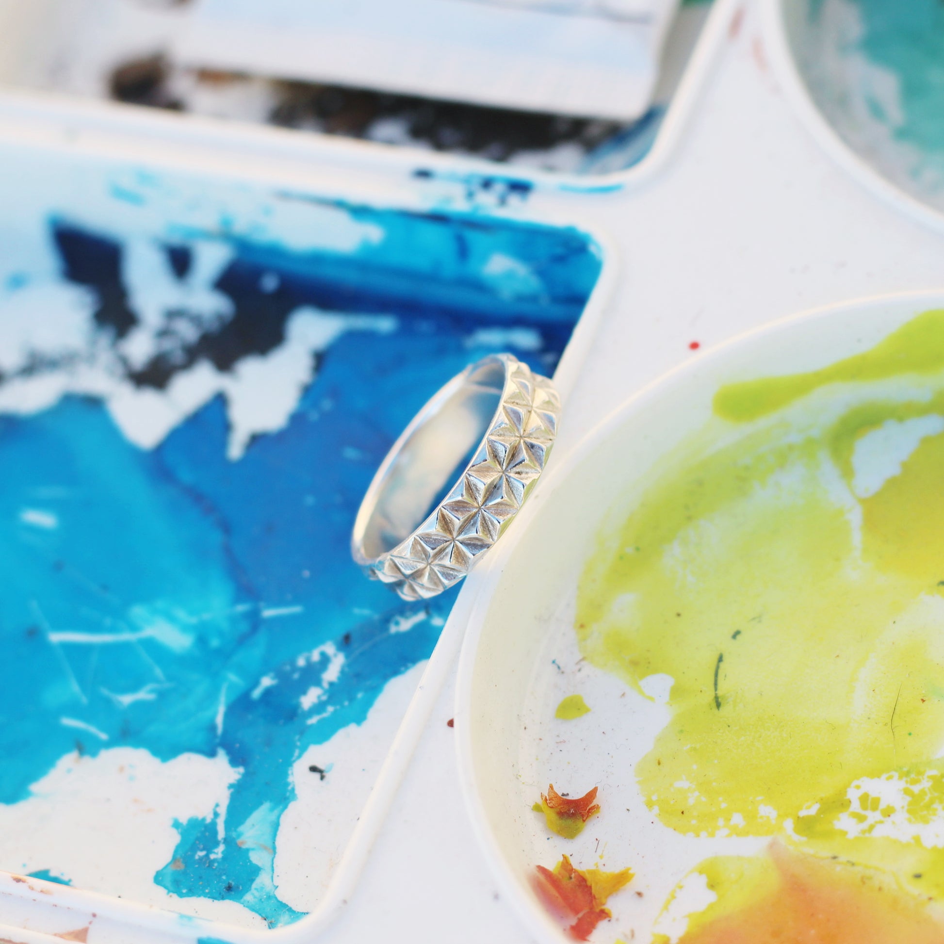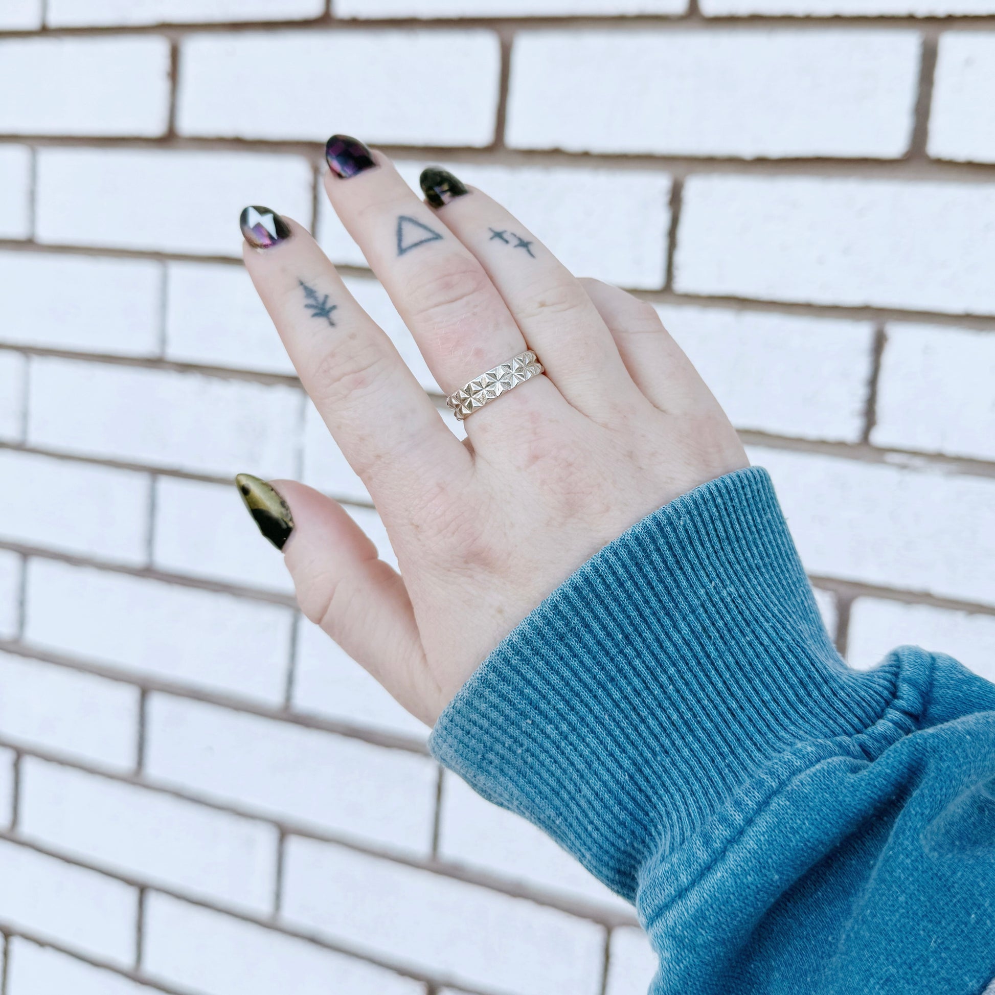 This piece is 3D modeled by us and cast in silver at our studio in Utah. The texture wraps all the way around the band for a seamless finish. The band is 6 mm in width.