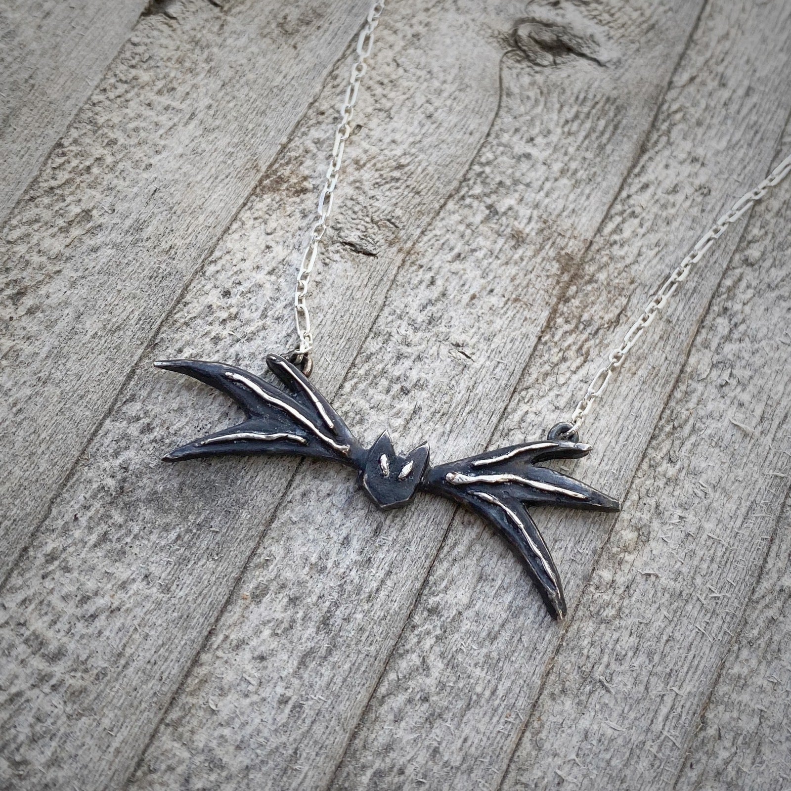 This piece is hand carved and cast in silver at our studio in Utah. The silver is blackened with liver of sulfur and coated in jewelers wax to preserve the color. This pendant is approximately 45 mm wide and 15 mm from top to bottom. Customize your pendant with style options; cable chain, cable with beads, beveled long and short, diamond cut rolo, patterned cable, dapped cable, and diamond cut figaro and 16", 18", 20", 22", or 24" length variations.