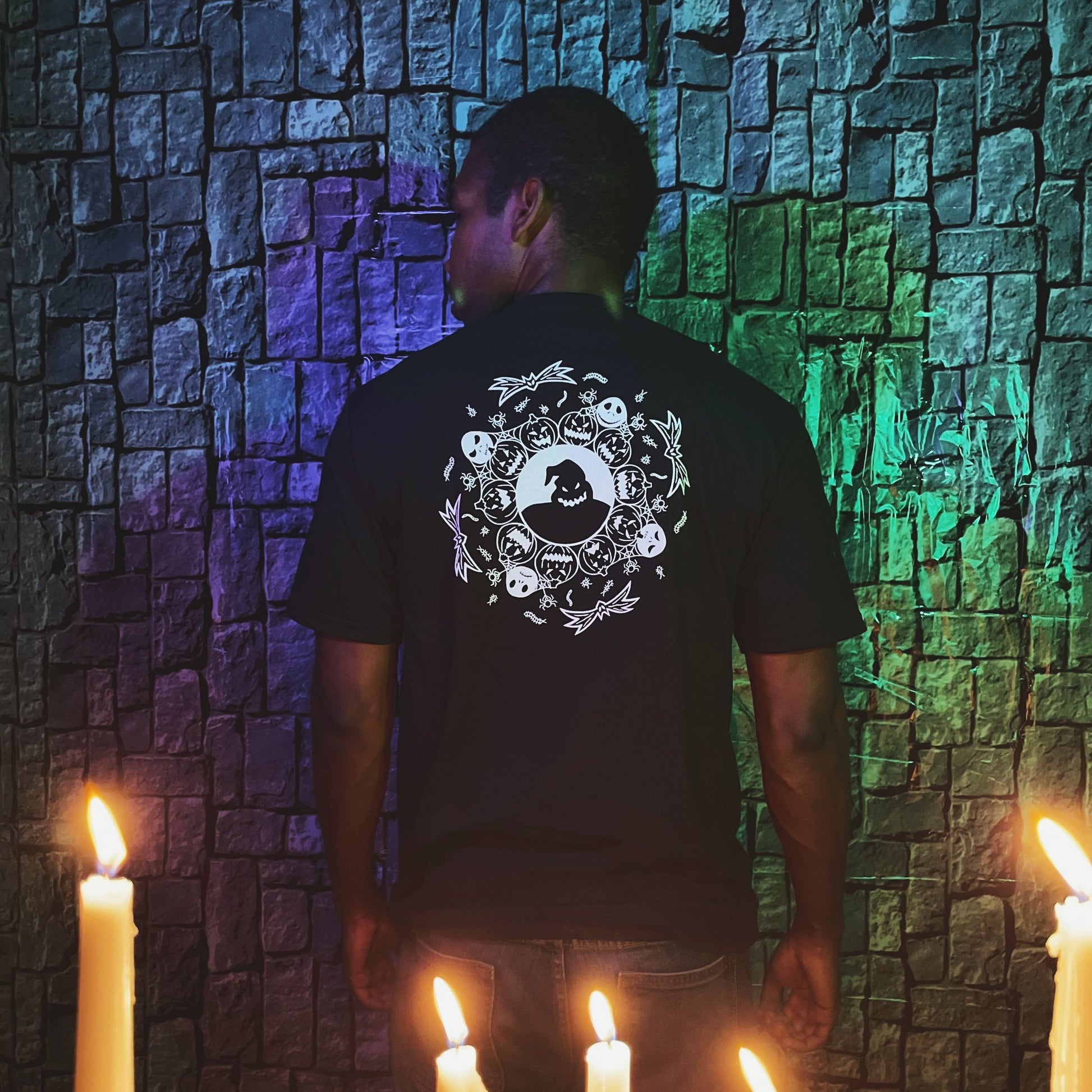 The front features a 4" Oogie Dice design on the left chest, with a 10" mandala on the back. The shirts are a super comfy cotton/poly blend with a unisex fit. Available in XS-4XL, see fit guide to pick your perfect size.