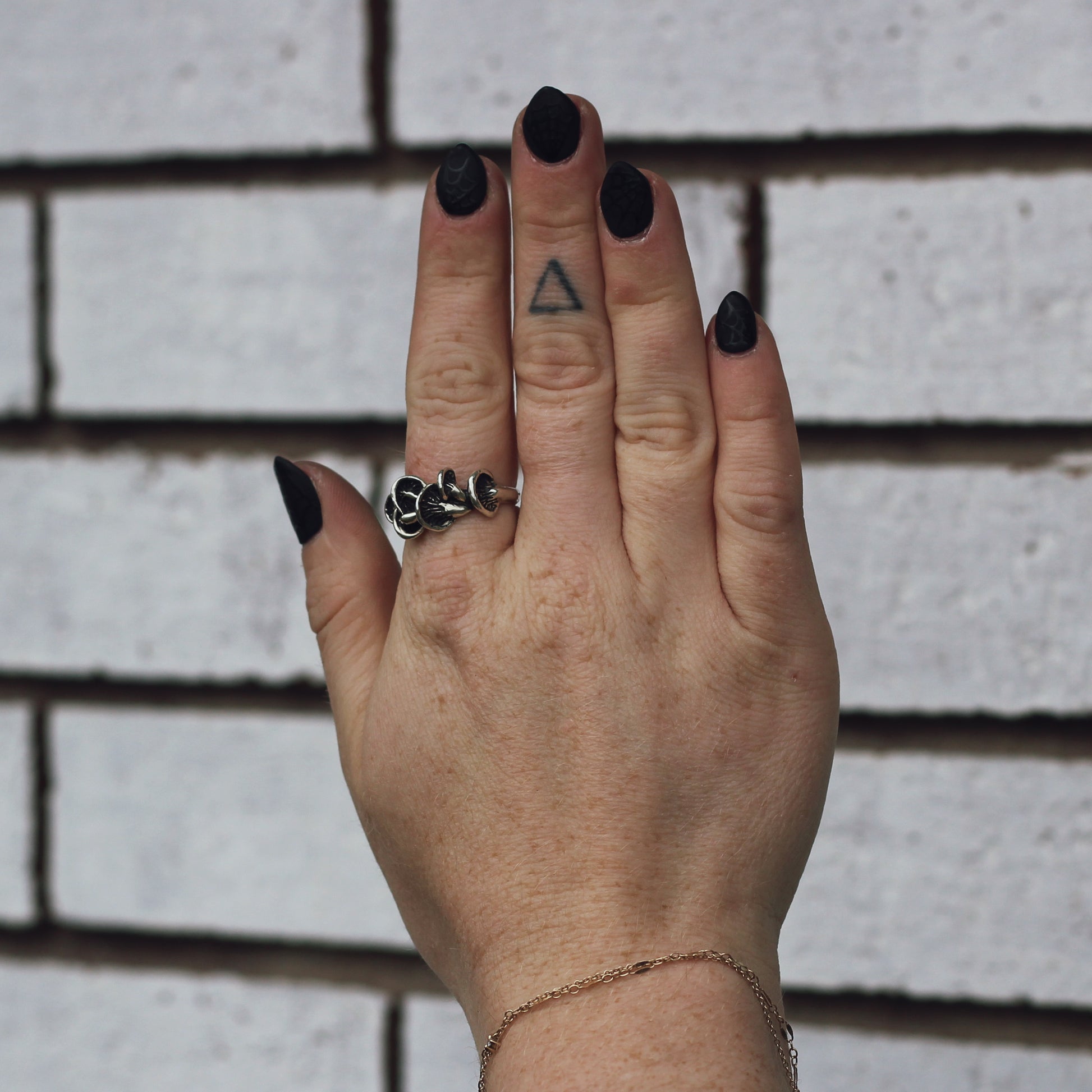 This ring is hand carved and cast in solid silver at our studio in Utah. The silver is blackened with liver of sulfur and coated in jewelers wax to preserve the color. The mushrooms are 3D and stick up off the finger roughly 7 mm and are approximately 11 mm wide.