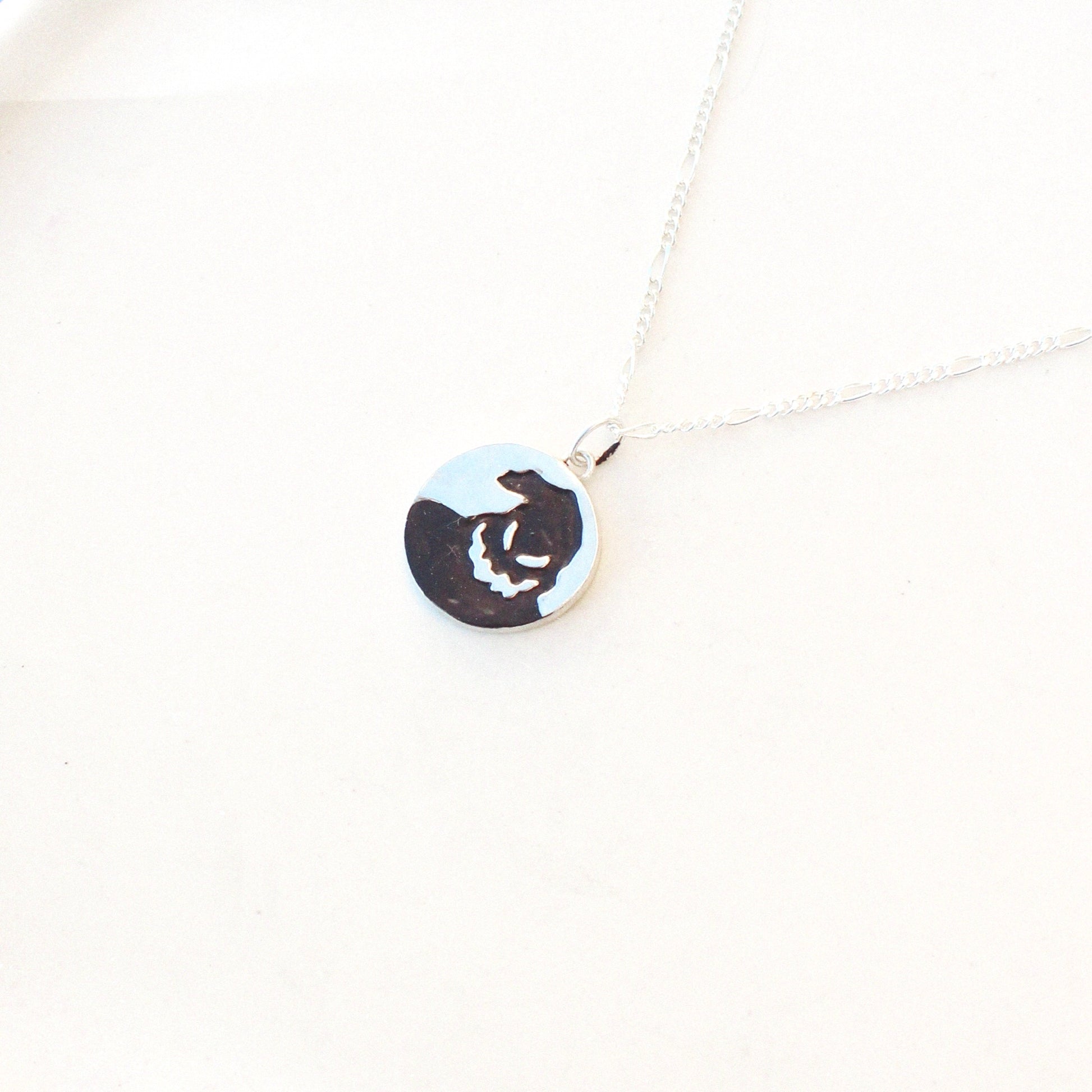 This piece is hand carved and cast in solid silver at our studio in Utah. The silver is blackened with liver of sulfur and coated in jewelers wax to preserve the color. This pendant is approximately 20 mm in diameter. Customize your pendant with style options; cable chain, beveled long and short, and cable with bead and 16", 18", 20", 22", or 24" length variations.